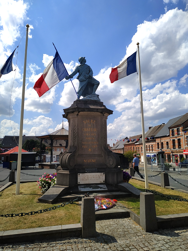 En face de l’hôtel de ville, le monument aux morts de la Grande Guerre représente, juché sur un piédestal en pierre bleue, un poilu casqué prêt à jeter une grenade. A ses pieds, un casque à pointe allemand.