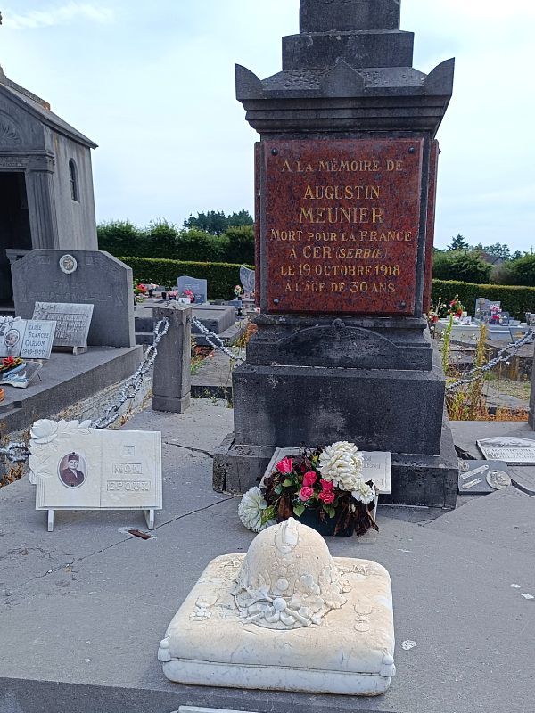 Sur la tombe d’Augustin Meunier, on peut voir une sculpture représentant un coussin sur lequel sont posés un casque et deux médailles (croix de guerre et médaille militaire). Augustin s’est retrouvé sur le front en Grèce et en Albanie. Il est décédé en Macédoine d’une maladie contractée au front.