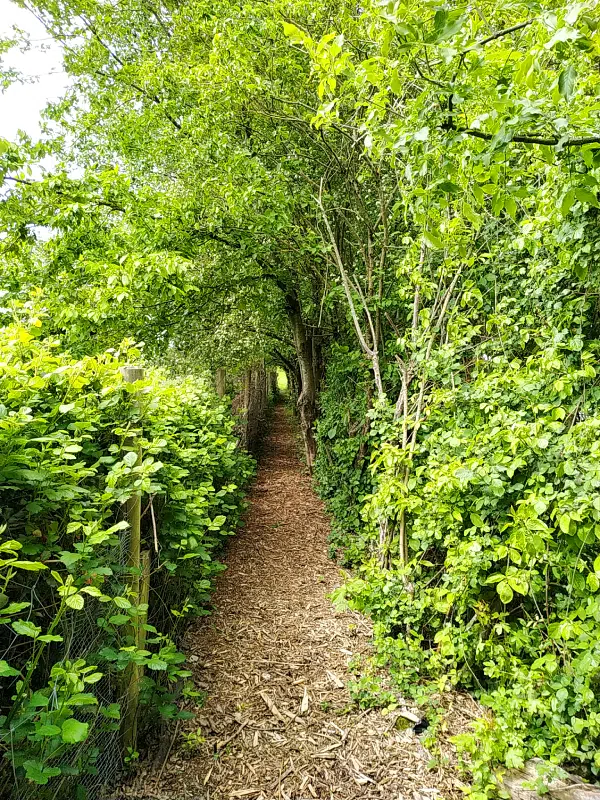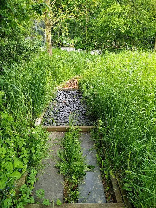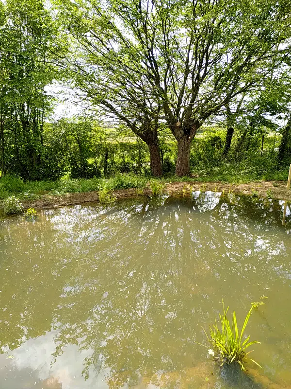 - une zone semi-sauvage avec sa mare (têtards et grenouilles) et son sentier ludique « les sens par les pieds nus » (ça pique et ça chatouille !),