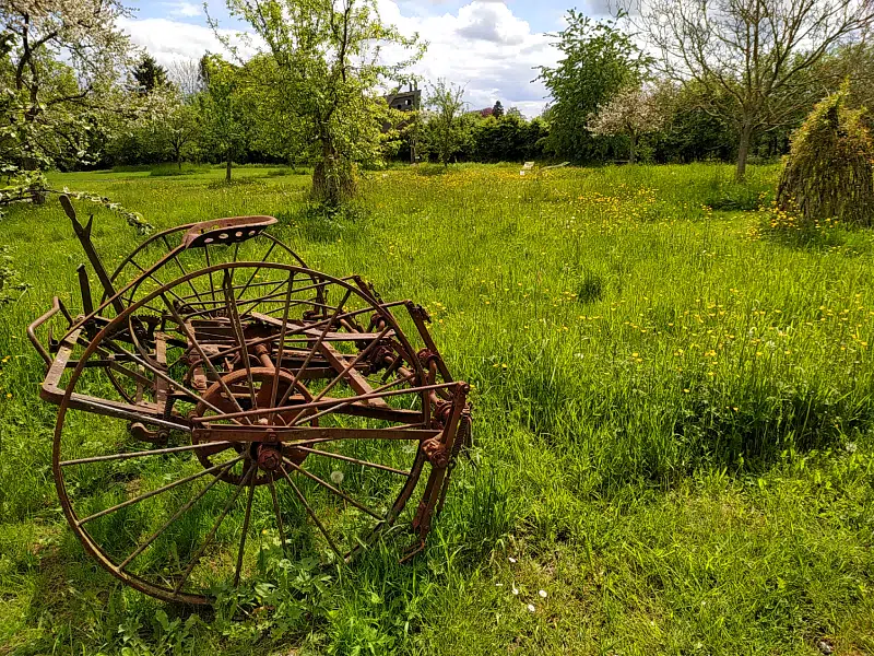 Le verger accueille quelques machines agricoles anciennes : charrues, faneuses, souffleurs à foin, tracteurs…