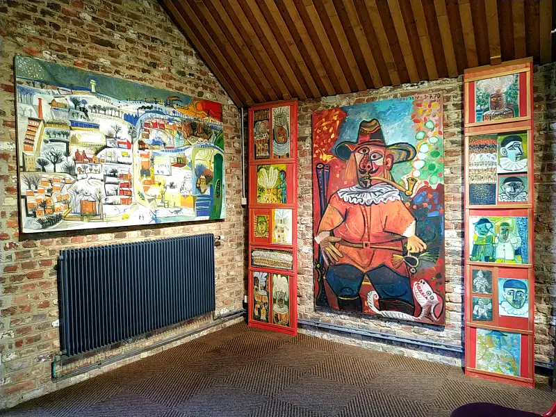 Enfin, dans la salle de conférence, vous pouvez admirer une exposition de tableaux de Raymond Debiève, un peintre moderne originaire du Nord. Né en 1931 à Maubeuge, Raymond Debiève a « observé toute sa vie le monde qui l’entourait : ses paysages, les corons, les terrils, les fermes, les moissons, mais surtout les êtres qui les peuplaient ».