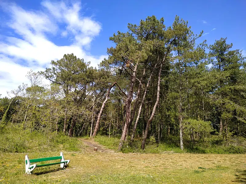 Plusieurs sentiers balisés permettent de faire le tour du bois de Brighton. Un banc a été planté dans la clairière pour faire une pause et prendre le soleil.