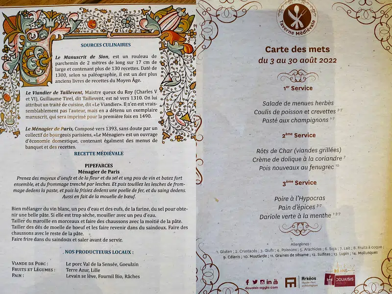 Du mercredi au dimanche, la taverne vous propose une véritable découverte dégustative et historique. L’été, vous savourez par exemple des tartes, tourtes et « pastés », salés ou sucrés, réalisés d’après des recettes issues de différents ouvrages culinaires du moyen-âge, cuisinés avec des produits locaux, en circuit court et majoritairement bio !