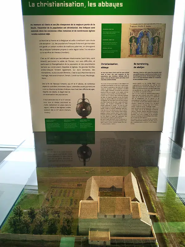 Lorsque l’abbaye sortira de terre, elle illustrera le pouvoir religieux. Les fouilles archéologiques ont révélé qu’un petit monastère féminin se dressait non loin de Douai. Il servira de modèle à la reconstitution proposée sur le parc avec une église en pierre de 26 m de long pour 8,50 m de large et un cloître en bois formant un quadrilatère de 23 m de côté !