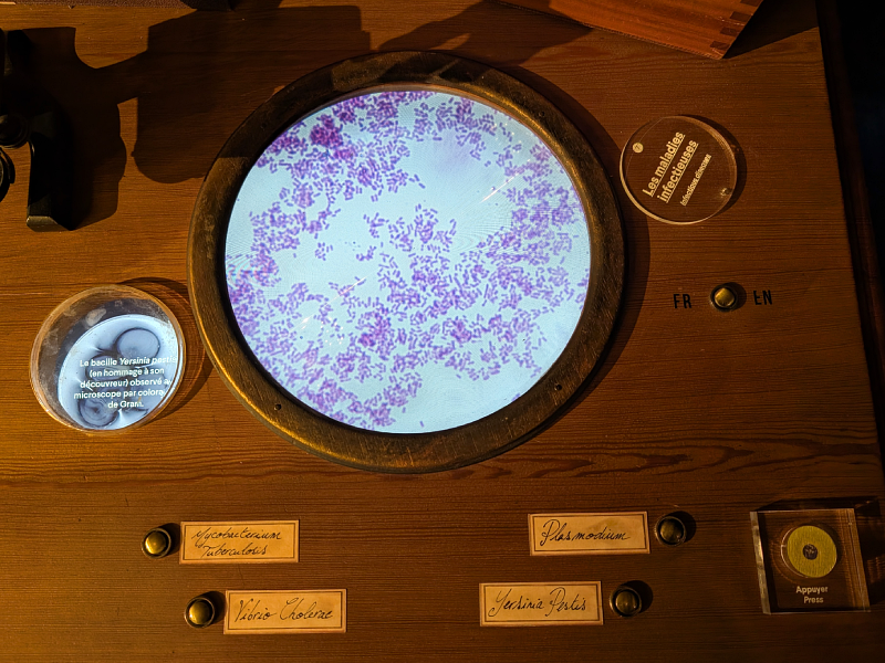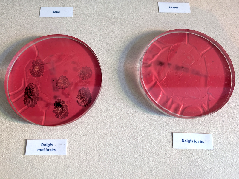 La visite se termine par une petite pièce qui met en valeur les recherches des laboratoires nordistes ANIOS (qui ont financé la création de ce nouveau musée). Vous pouvez glisser vos mains dans un appareil qui met en lumière les bactéries ou regarder des (faux) microbes dans un microscope.