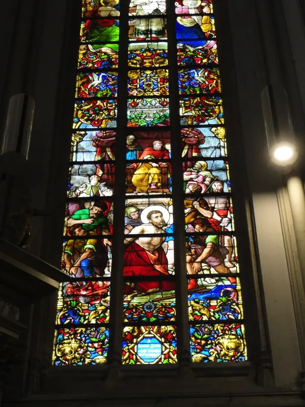 Le grand chœur, au fond, présente 5 immenses vitraux qui figurent parmi les plus colorés et les plus beaux de la région, et les plus hauts de France (17 mètres). Ces somptueux vitraux ont été créés par Nicolas Lorin, entre 1873 et 1876.