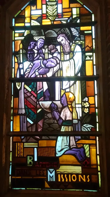 – Les vitraux furent réalisés en 1936 et 1937 (jusqu’à cette date, les fenêtres furent garnies de verre jaune).