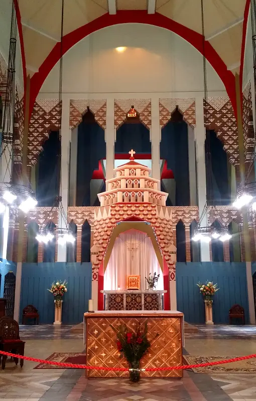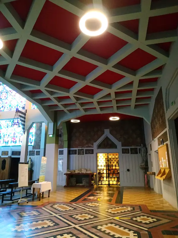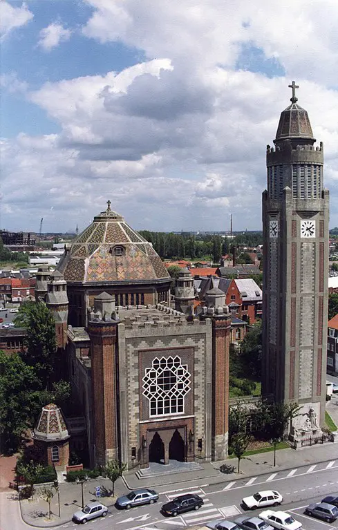 L’utilisation de la brique et de la céramique rappelle toutefois la tradition flamande et l’église a été bâtie en béton armé, le nouveau matériau, pratique et solide, de la Reconstruction. Ainsi, le dôme qui surmonte la coupole est formé d’une double coque en béton armé, couverte de céramique polychrome.