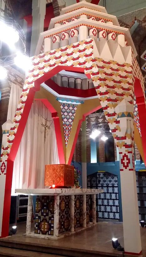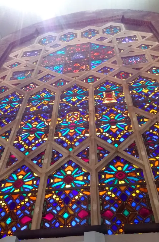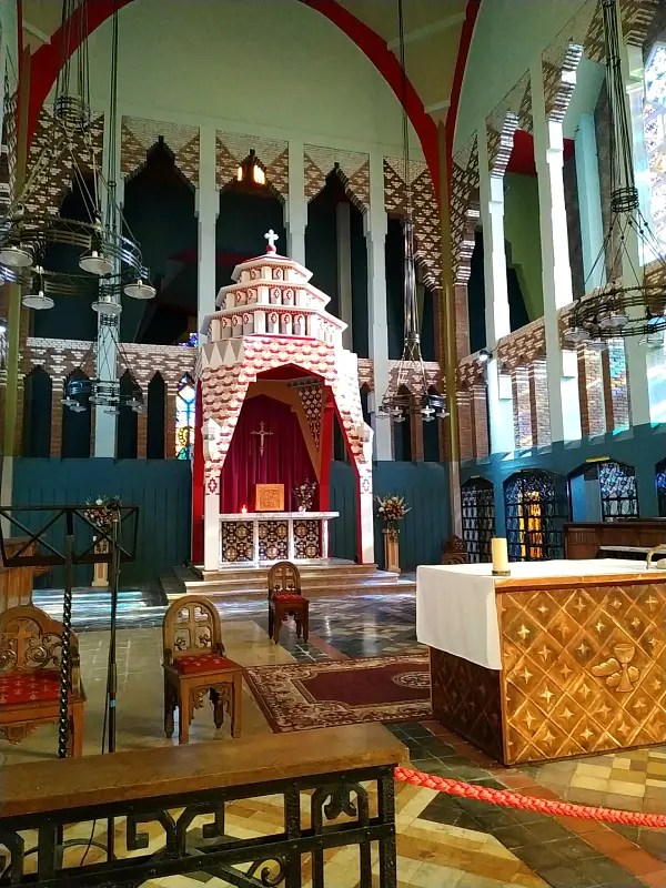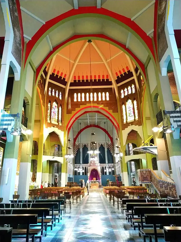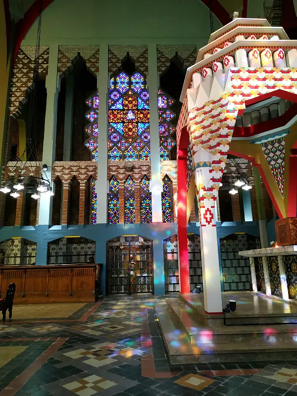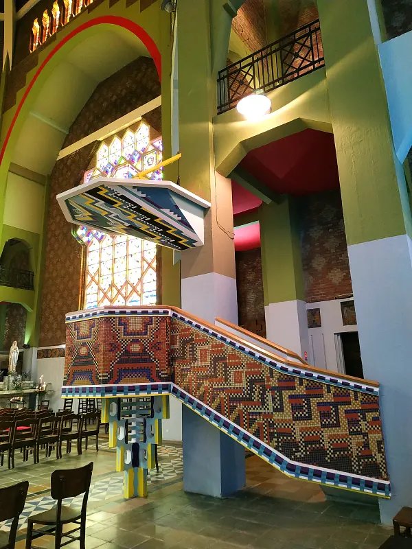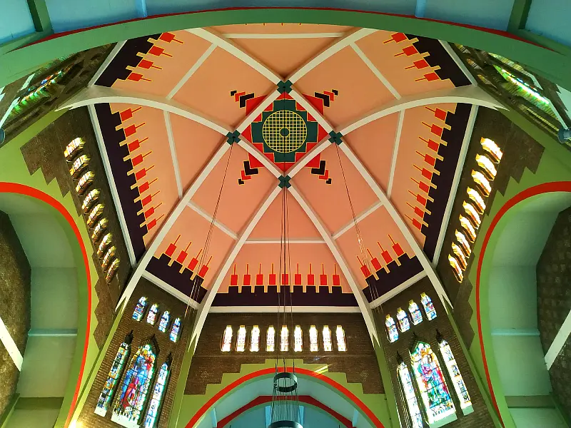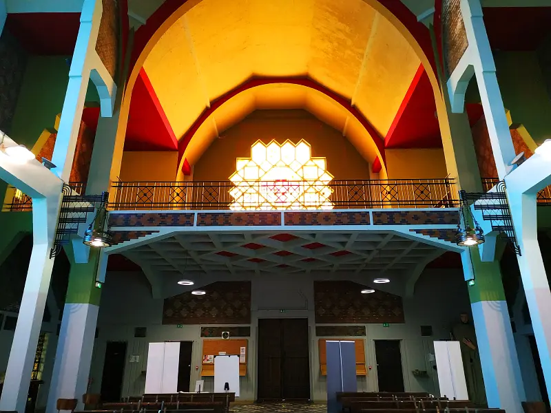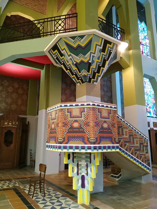 Le dôme polygonal, recouvert de mosaïques en céramique, n’est qu’un avant-gout de la polychromie qui va s’exprimer pleinement dans l’église.