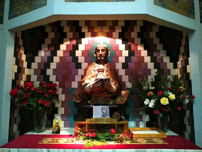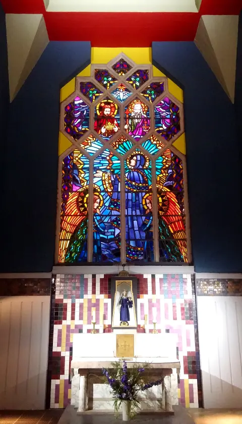 – En 1930, on installa dans le chœur un maître-autel de marbre blanc, sous lequel le maître verrier et mosaïste Gaudin conçut un tombeau en mosaïque.