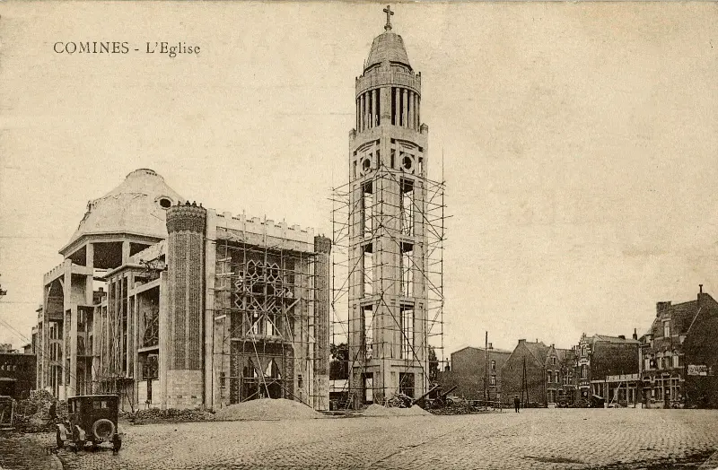L’ancienne église de Comines (la collégiale Saint-Pierre) avait été détruite pendant la guerre 1914-1918. Édifiée vers le 3e siècle, elle avait tour à tour été détruite et reconstruite, suivant les guerres de religion puis la Révolution. Comme de nombreuses villes des Hauts-de-France, Comines voulut reconstruire une nouvelle église… mais elle ne le fit pas comme tout le monde !