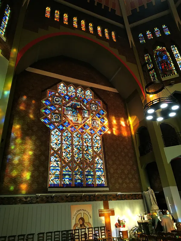 On est également surpris par l’usage revendiqué du béton armé. Dans les années 1920 et 1930, la structure en béton des beaucoup d’églises reconstruites a systématiquement été recouverte de briques pour donner l’impression qu’elles étaient plus anciennes. Maurice Storez et Dom Bellot, eux, ont décidé de laisser visible l’ossature de béton, et les parties ajourées ont été comblées avec des briques et des parpaings de différentes couleurs.
