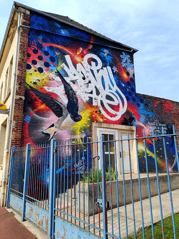 Commencez toutefois la promenade par les fresques d’art urbain réalisées en 2020 sur les pignons de la poste : « une hirondelle prenant son envol », réalisée par Zenoy, et un grand visage, « Utopie-02 », par Hopare, deux très belles œuvres de street-art.