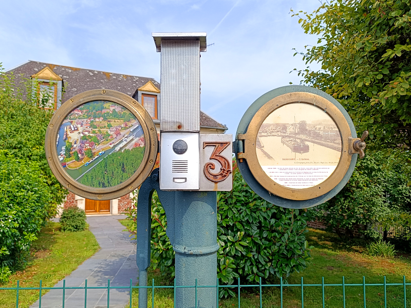 En retrouvant le panneau sur le circuit 14-18, vous pouvez tourner à droite et retrouver le village de Pont-l’Evêque, ou continuer tout droit pour retourner au port.