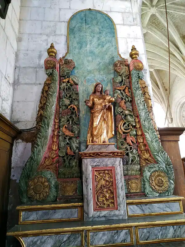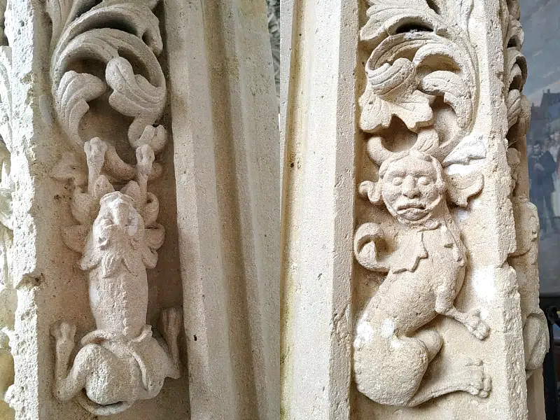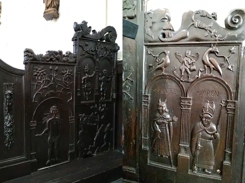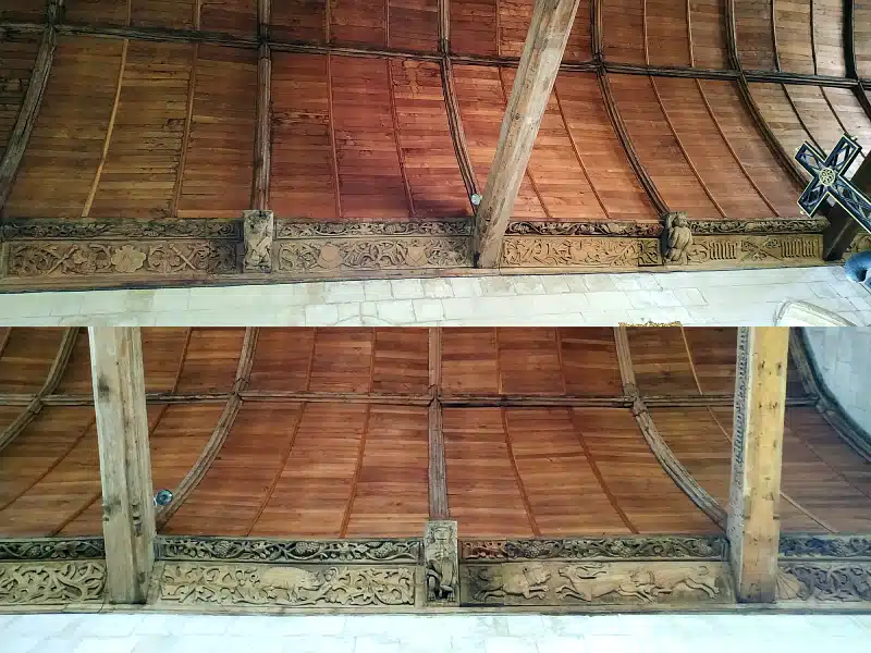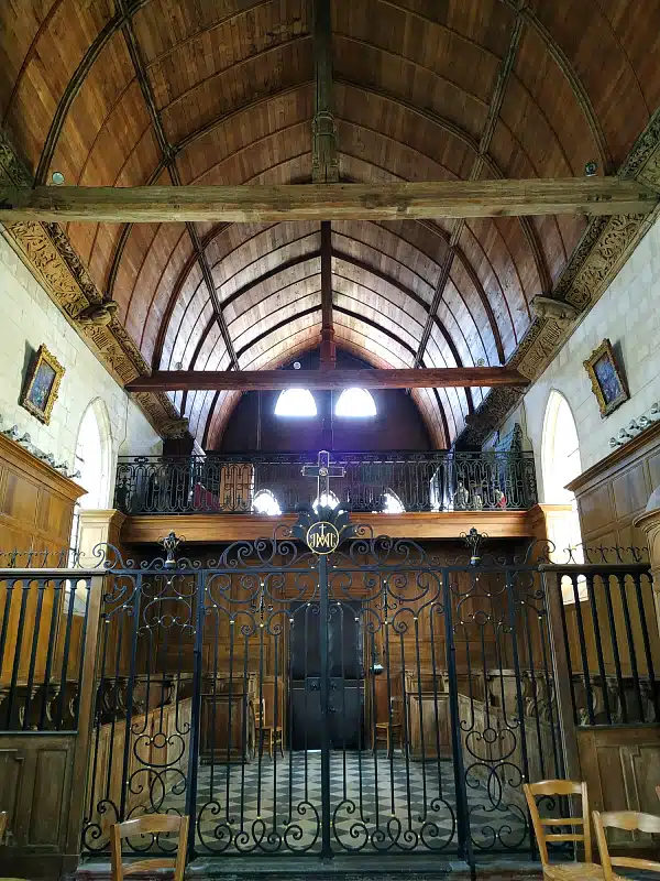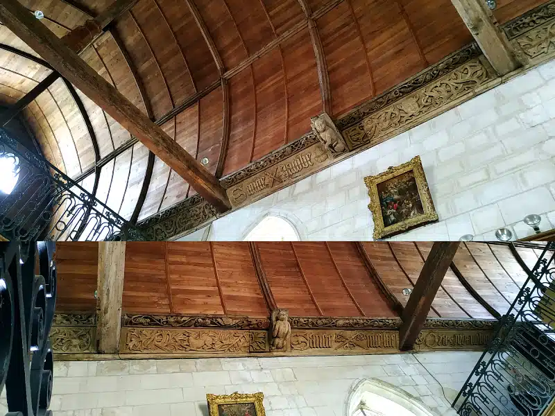 Sur les poutres en bois, vous distinguez des scènes de chasse (avec chien, sanglier, cerf), des animaux (escargots, oiseaux, singes…), des inscriptions et les symboles du chemin de Saint-Jacques de Compostelle (coquillage, sac et bâton). Sur la poutre de gloire dans la nef, on peut lire l’inscription : « En l’an quinze cent et sept fut fait ce chœur et l’an quinze cent douze fut cette nef faite ».