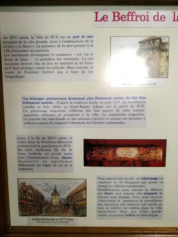 À partir du 12e siècle et de la découverte du « crucifix », les habitants de Rue s’enrichirent grâce aux pèlerins et aux commerces, au point qu’en 1210, les bourgeois décidèrent de s’affranchir de l’autorité seigneuriale en achetant leur liberté communale. Après qu’elle leur a été accordée par le comte Jean-de-Ponthieu et transcrite dans une charte, ils construisirent un beffroi en bois, symbole de leur indépendance.