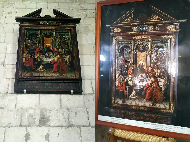 Un petit panneau en bois peint représentant la cène porte une date (1641) et une inscription en latin, a priori ajoutée en 1769, citant Saint Mathieu.